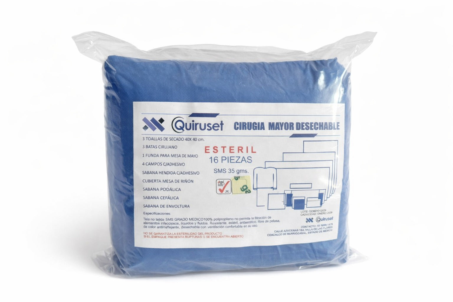 Paquete quirúrgico desechable estéril diseñado para procedimientos de cirugía mayor. Fabricado en tela no tejida SMS de polipropileno grado médico (35 g/m²), proporcionando resistencia, barrera contra fluidos y comodidad durante su uso.